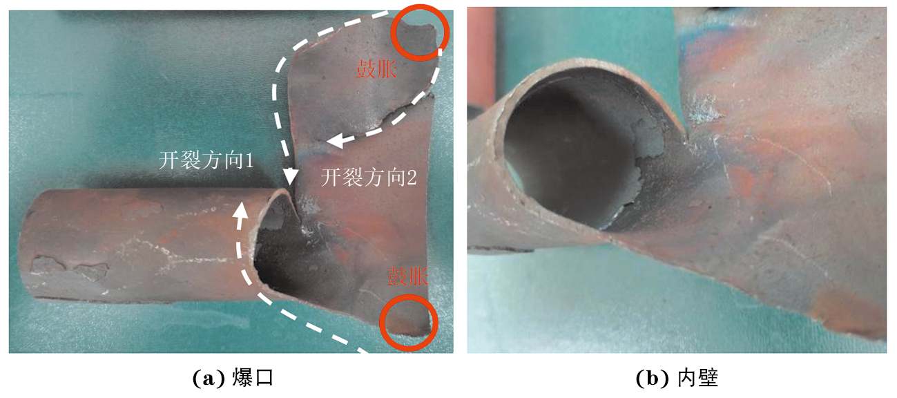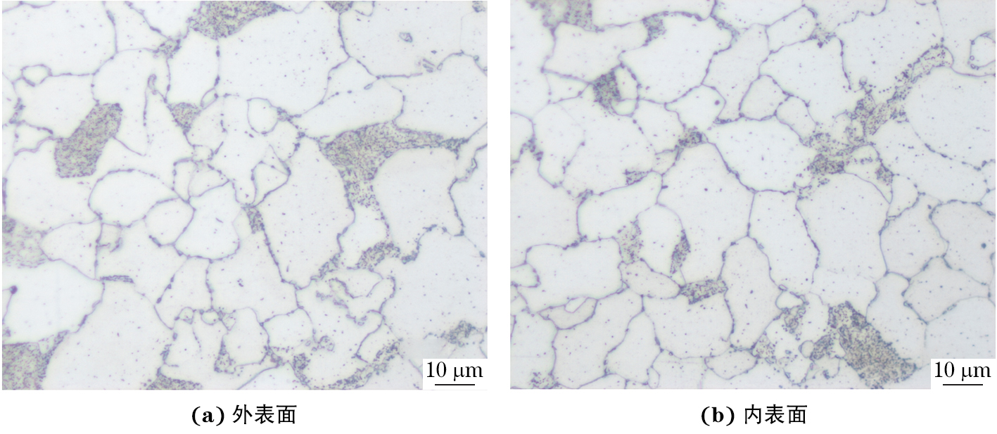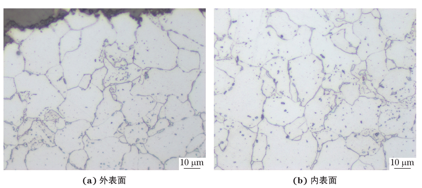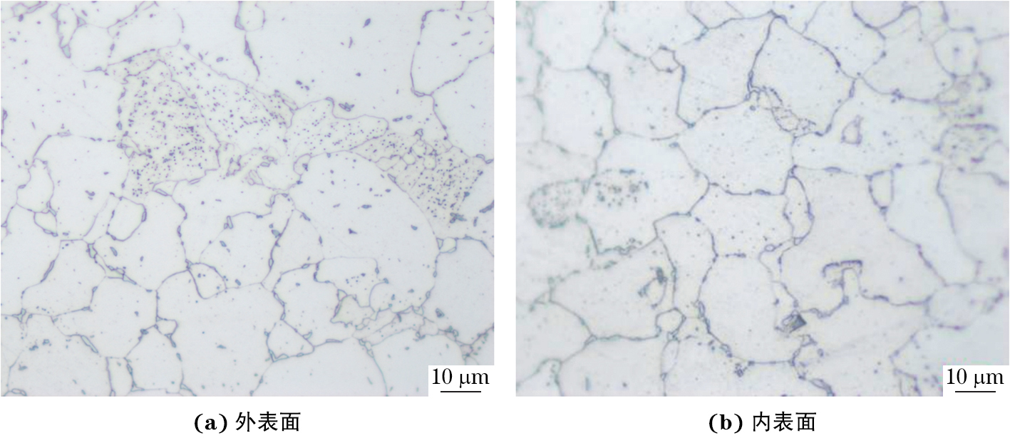 依据标准GB/T 4340.1—2009《金属材料 维氏硬度试验 第1部分:试验方法》,在爆口处、离爆口500 mm和远离爆口的位置取样,由于爆口处管壁减薄量大,故对其进行表面维氏硬度测试,结果如表3所示。由表3可知:爆口处材料的硬度低于标准值;离爆口500 mm的材料硬度仍低于标准值,接近标准下限;远离爆口材料的硬度符合标准值。