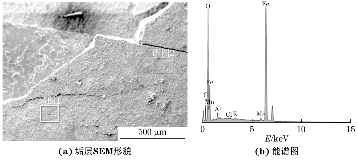 利用能谱仪对爆口处内壁垢层进行能谱分析,结果如图5所示。由图5可知:垢层化学成分中以Fe元素和O元素为主,说明垢层物质为铁的氧化物,未见Ca、Mg等常见水垢元素,分析该垢层物质应为服役过程中腐蚀形成的铁垢。