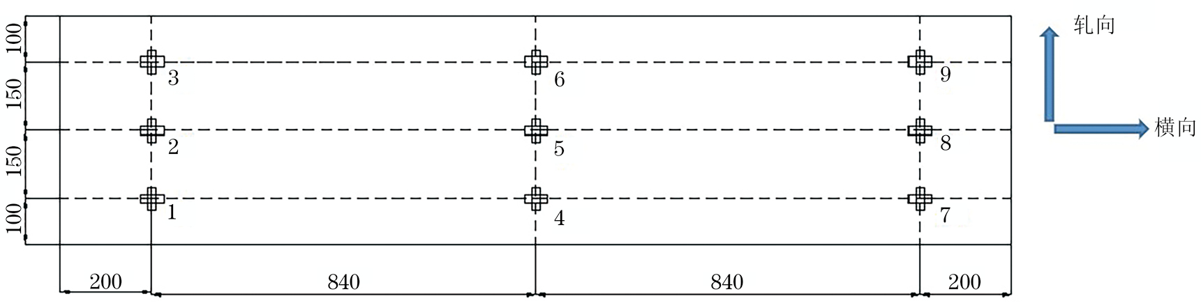 超声波残余应力测试严格依据国家标准GB/T 32073—2015进行。试验采用HS1010型便携式超声波残余应力测试仪,配置2.25 MHz探头,探测深度为2.8 mm。试验前,首先按照国家标准要求完成BS960E钢的超声残余应力标定参数K的测定。具体方法为:对如图1所示的去应力标定拉伸试样进行分级加载,通过建立超声波声速与外加应力的对应关系曲线,获得标定参数。超声残余应力测试采用多点测量方案,具体测点分布如图2所示。