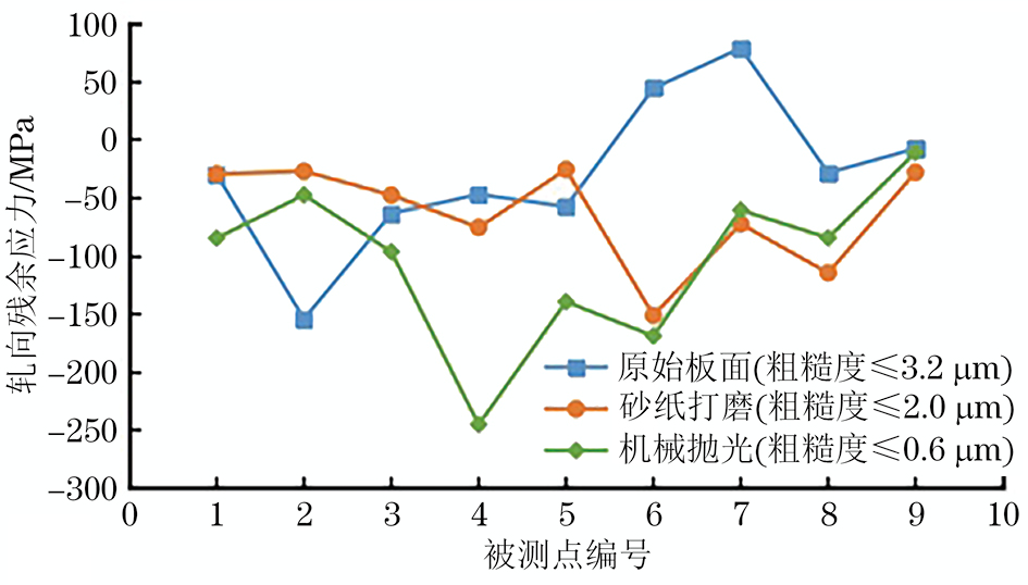 (1)表面氧化铁皮对测试精度的影响显著。虽然机械抛光可提高测试结果的准确性,但会引入200~350 MPa的额外压应力,并破坏钢板的交货状态。建议采用180目砂纸打磨去除氧化铁皮和浮灰,该方法既能保证测试精度又可维持材料的原始状态。