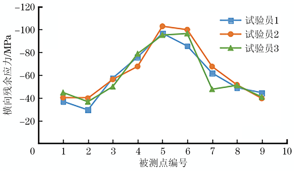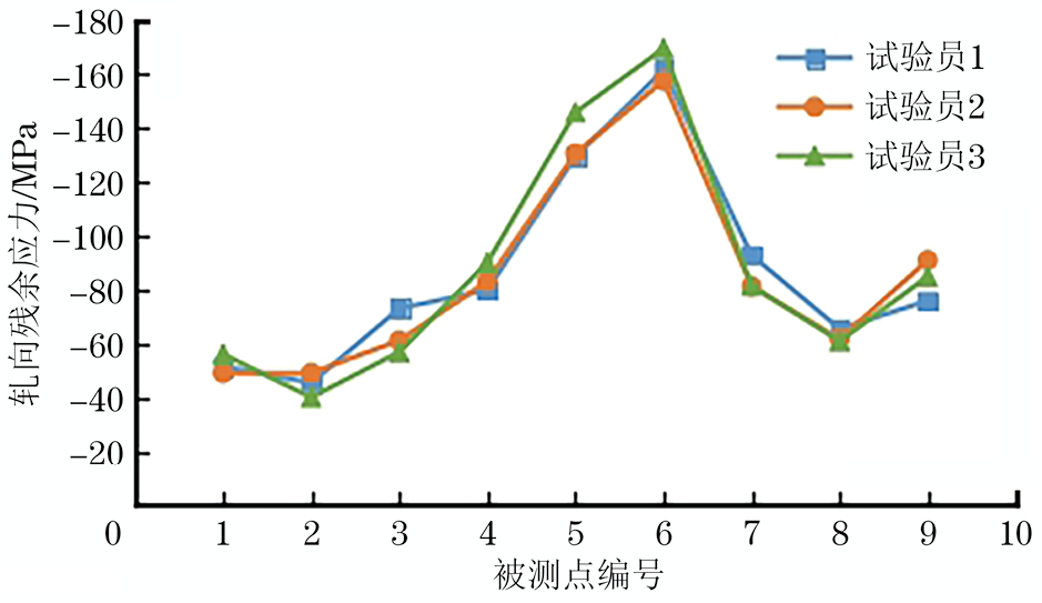 在规范操作流程的条件下,3名测试人员获得的残余应力测试结果具有良好的一致性。具体数据表现为:轧向残余应力平均值分别为-86.1,-84.9,-87.2 MPa;横向残余应力平均值分别为-59.6,-62.7,-60.0 MPa,各平均值偏差均控制在5 MPa以内。